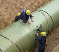 由計算機(jī)控制,在芯模上按規(guī)定的與纖維纏繞玻璃鋼管相同的工藝制造內(nèi)襯,凝膠后按設(shè)計好的線型和厚度纏繞結(jié)構(gòu)層,并將石英砂與樹脂混合的砂漿纏在結(jié)構(gòu)層中,再纏繞外保護(hù)層。