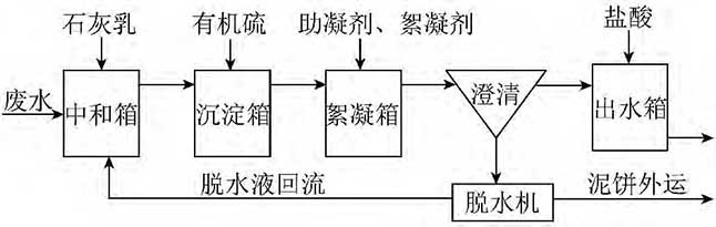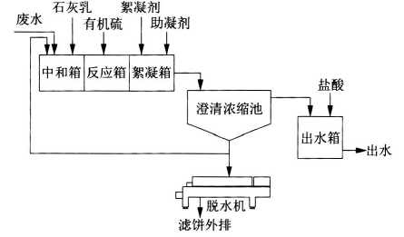 本處理系統(tǒng)包括:廢水池、清水池、混合反應器、三聯(lián)箱、澄清器、壓濾機、各種加藥裝置等。