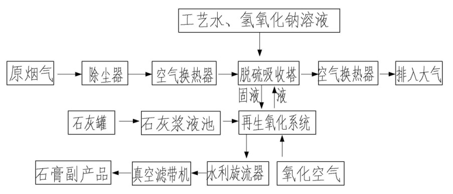 再生后所得的NaOH溶液送回吸收液系統(tǒng)使用,所得的半水亞硫酸鈣經(jīng)氧化,可制成石膏(CaSO4•2H2O)。