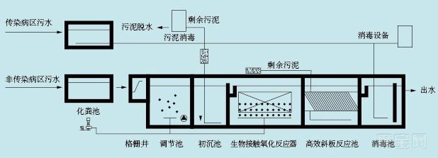 醫(yī)療廢水首先進(jìn)入化糞池, 在池中厭氧反硝化, 然后經(jīng)過格柵將大顆粒的漂浮物和懸浮物去除, 進(jìn)入水解酸化池和生物接觸氧化池, 使污水充分的硝化和反硝化, 將富磷污泥排出, 使污水中的BOD5、COD、S S、NH3- N、TP、T N 得以去除, 然后進(jìn)入接觸消毒池, 污水經(jīng)過二氧化氯消毒后達(dá)標(biāo)排放。污泥經(jīng)消毒后由吸污車定期清理, 或經(jīng)污泥壓濾機(jī)制成濾餅后,運(yùn)到垃圾填埋場(chǎng)集中處理。